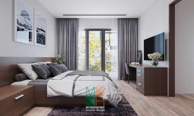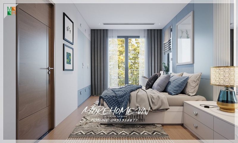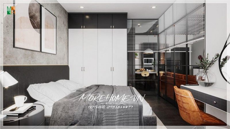 Giường ngủ hiện đại với đầu giường bọc nệm điểm nhấn cho chiếc giường ấn tượng cho phòng ngủ căn hộ. Bên trên đầu giường được treo tranh canvas đơn giản nhưng khá phù hợp với màu sắc của phòng.